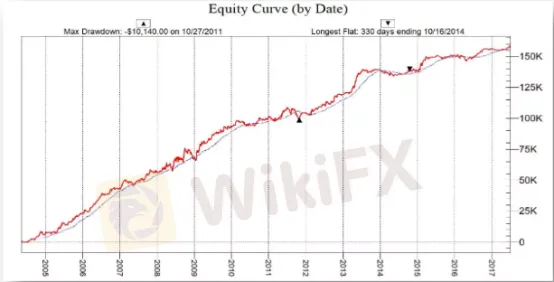 回測數據跨度13年,總交易2433筆,平均每筆盈利65美元,總計盈利158520美元,最大回撤-10140美元。