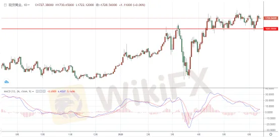 摘要:黃金方面,週五(6月12日)亞市早盤,現貨黃金位於1730美元附近徘徊,目前暫位於1728.56美元/盎司。由於市場對於第二波冠狀病毒感染的擔憂,以及美聯儲將維持利率在低位的承諾,現貨黃金一度大漲,但是由於避險資金湧入美元,致使黃金承壓受挫。