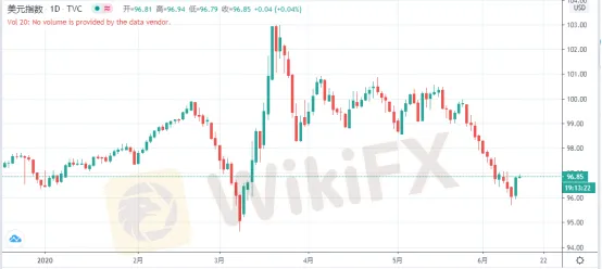 週五(6月12日)亞洲時段,美元指數震盪上漲,現交投於96.85一線。
