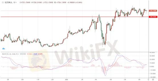 黃金方面,週二(6月16日)亞市早盤,現貨黃金窄幅震盪於1725美元附近,目前暫位於1725.61美元/盎司。雖然市場對於第二波冠狀病毒感染的擔憂,刺 激了市場避險情緒的升溫,但是美元的走強限制了金價的漲幅,黃金昨日一度跳水下逼1700關口。