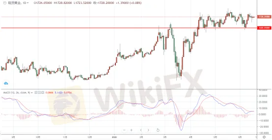 匯信團隊指出,國際現貨黃金週二亞市早盤開於1724.26美元/盎司,最高上漲至1732.70美元/盎司,最低下探1716.31美元/盎司,收於1726.14美元/盎司,上漲1.90美元或0.11%。今天亞市早盤現貨黃金繼續持穩於1725關口上方,目前暫持穩於1728.24關口上方。從日K圖上看,現貨黃金近期波動較大,主要是由於近期市場的情緒變化莫測,一度由於國際貿易緊張局勢以及美國的示 威活動而導致避險情緒提升,現貨黃金一度反彈站上1740美元,但是隨著相關經濟數據的靚麗表現,市場的風險情緒一度回升,避險黃金承壓跳水一度下逼1670點整數關口,但是隨著市場對於疫情的第二波的擔憂,以及地緣政治的緊張情緒刺 激了市場的避險情緒,黃金目前持穩於1725美元上方,下方的支撐位依然是在1680美元一線,跌破看空。(僅供參考)