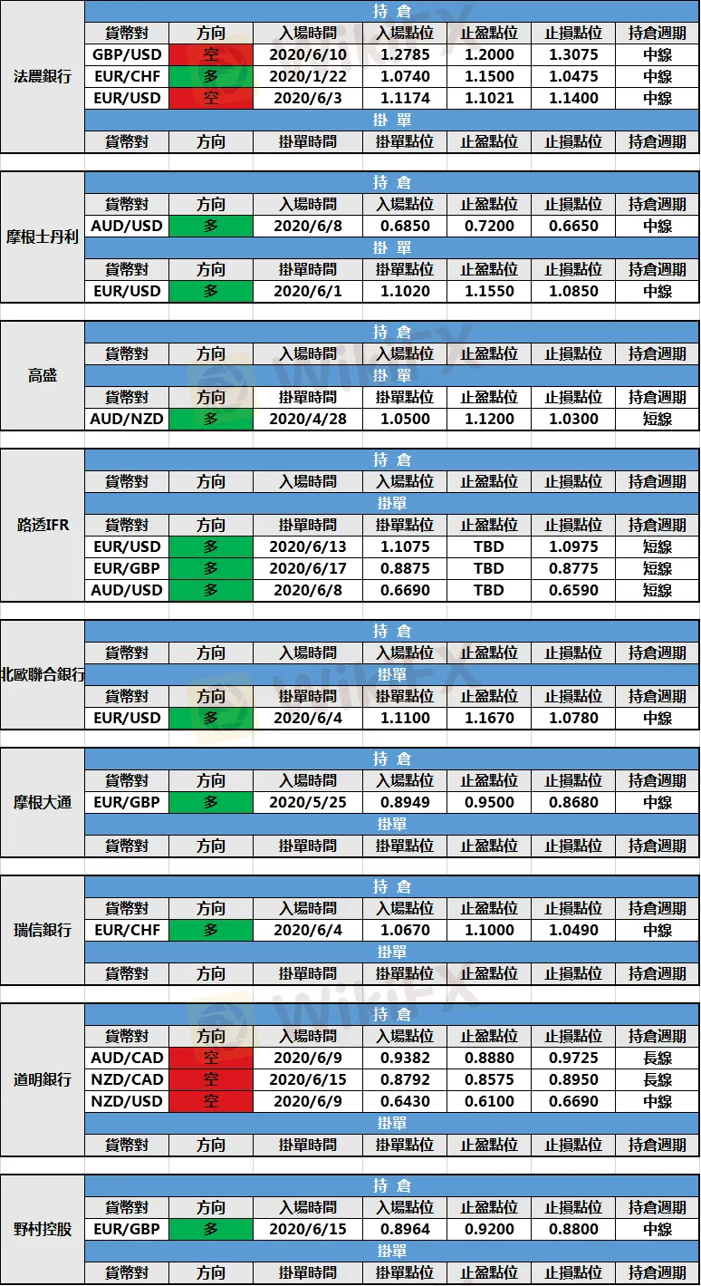 如下表所示:各投行持倉未變,截止發文前法農銀行英鎊/美元空頭持倉盈利150逾點。