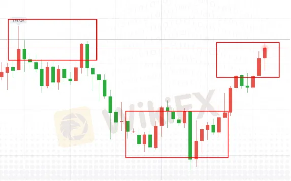 一邊在交易小週期的行情中,一邊還可以觀察和確認大行情的運行態勢。如以上的例子,黃金在1660附近跌不下之後,果然向著更高的價位前行著,把之前的小週期回看,會發現之所以回調是給大週期行情騰出一個更低的價位,以便能往更高的點位衝擊。