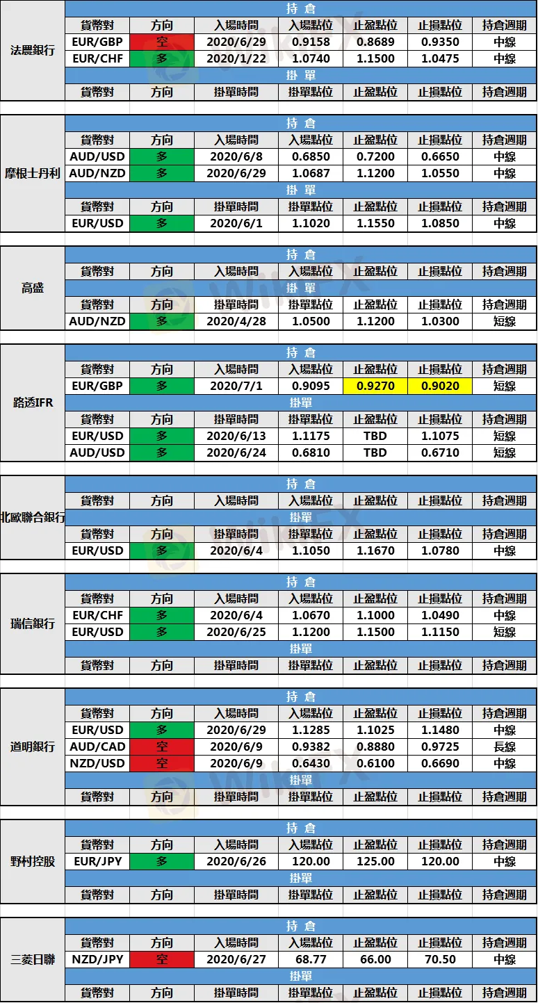 外匯天眼0727投行持倉報告:三菱日聯新增持倉 大摩和路透新建掛單
