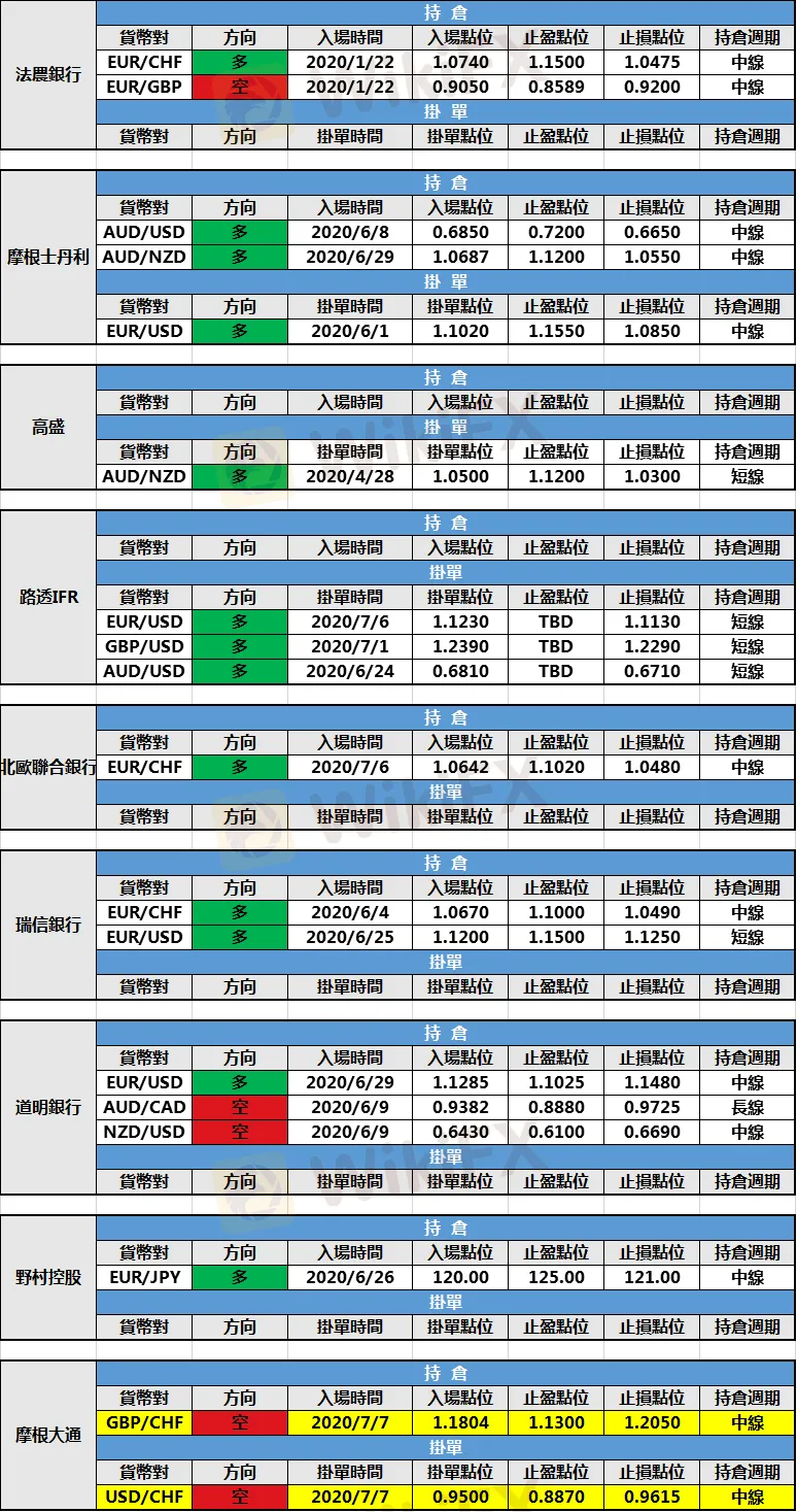 (1)摩根大通新增英鎊/瑞郎空頭持倉,入場點位1.1804,止盈點位1.1300,止損點位1.2050。