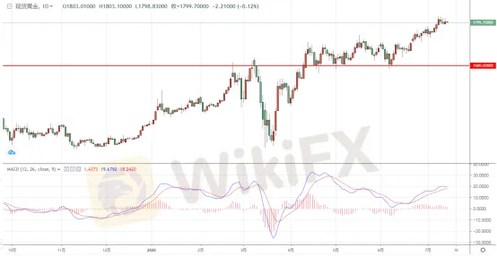黃金方面,週二(7月14日)亞市早盤,現貨黃金目前有所回落,整體 位於1800關口位置附近震盪,目前暫位於1799.49美元/盎司附近整理交投。黃金維持在高位的主要原因是由於新冠病毒病例激增提振了市場對更寬鬆貨幣政策措施的希望,致使市場避險情緒升溫。
