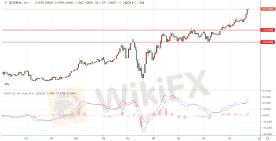 黃金方面,週四(7月23日)亞市早盤,現貨黃金窄幅震盪,進一步整固於1870關口上方,目前暫位於1871.18美元/盎司附近整理交投,逼近1850關鍵點位。黃金持續刷新九年來新高,黃金大漲的原因主要包括疫情加劇致使市場對於經濟復蘇擔憂,再疊加近期地緣政治風險急劇升溫,黃金開啟加速模式,站上1870關口。