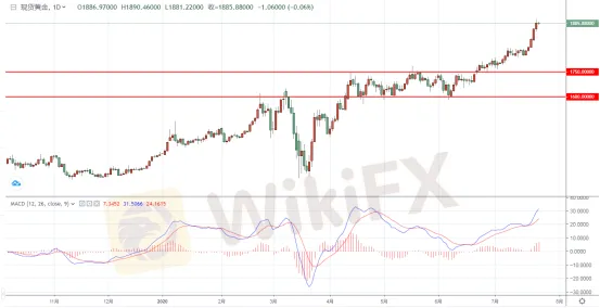 黃金方面,週五(7月24日)亞市早盤,現貨黃金高位開啟加速模式,金價連續飆升,目前暫位於1885.78美元/盎司附近整理交投,直指1900點整數關口。黃金持續刷新九年來新高的原因主要包括疫情加劇致使市場對於經濟復蘇擔憂,再疊加近期地緣政治風險急劇升溫,黃金開啟加速模式,目前看1900關口指日可待。