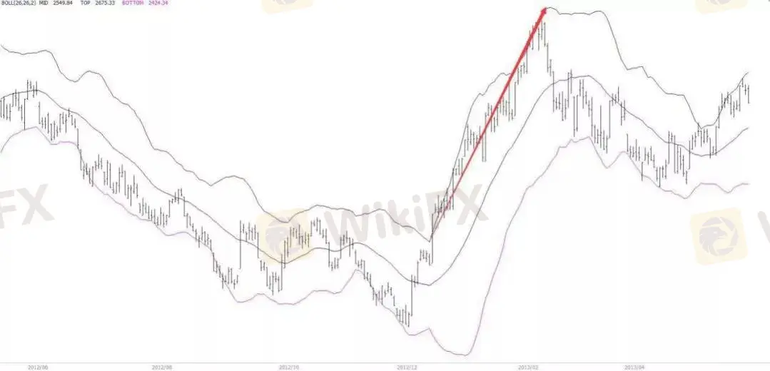 11、日線圖上,如果價格逐步上移至布林線的上軌並行走在上軌,分析指標同時呼應轉強,那麼,就可以判斷上升趨勢即將形成。下降趨勢同理。