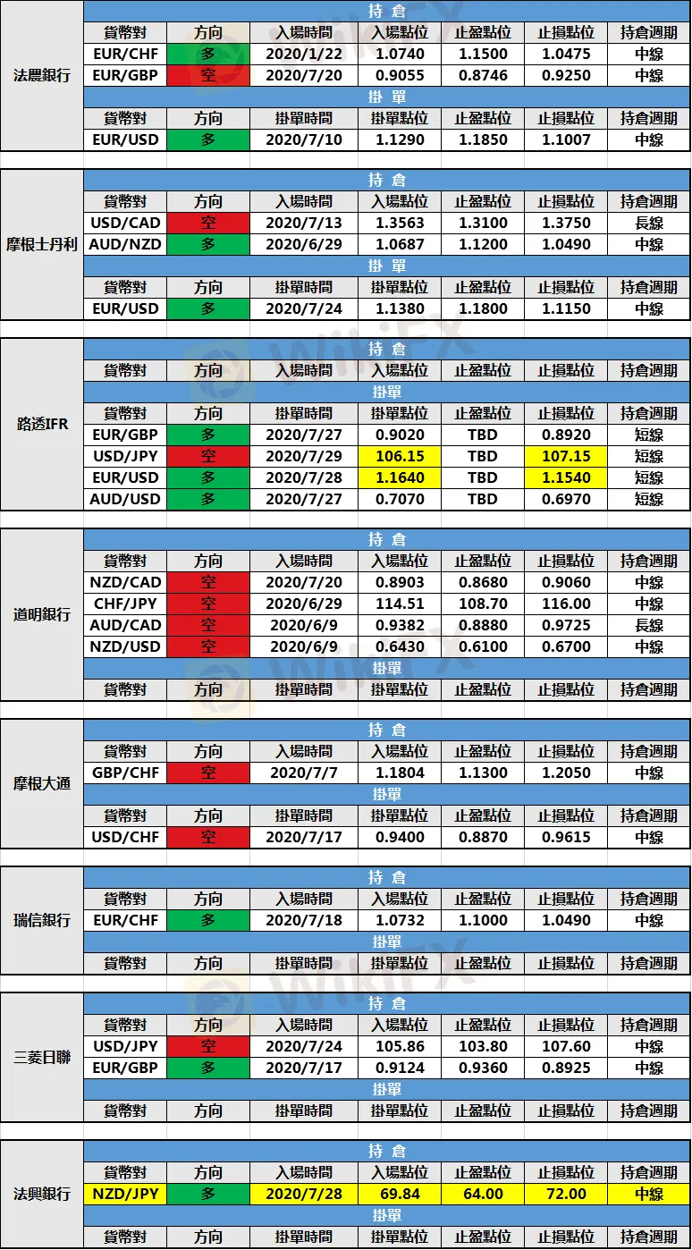 (1)法興銀行新增紐元/日元多頭持倉,入場點位69.84,止盈點位64.00,止損點位72.00。