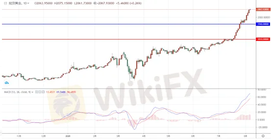 黃金方面,週五(8月6日)亞市早盤,現貨黃金加速上行,盤中是一度突破了2070關口最高上探至2075美金,雖然有所回落但位於2067.93關口附近震盪。黃金持續飆升的背後原因是多方面的,主要包括新一輪經濟刺 激可能達成,刺 激了通脹預期。低利率環境持續,美債收益率下挫,以及美元的走弱,地緣政治風險的加劇,加上今晚非農來襲,有資金提前入場也是一大推手。