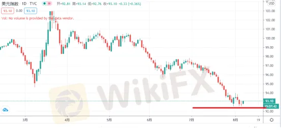 週五(8月7日)亞洲時段,美元指數震盪上漲,現交投於93.12一線。
