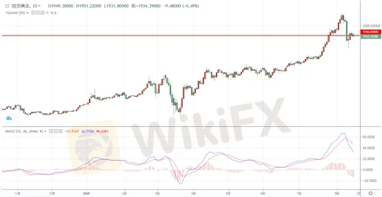 金價在早間觸及高點1950美元附近後漲勢乏力,隨後轉向下行,短線跳水失守1940關口,並不斷迫近1930美元。