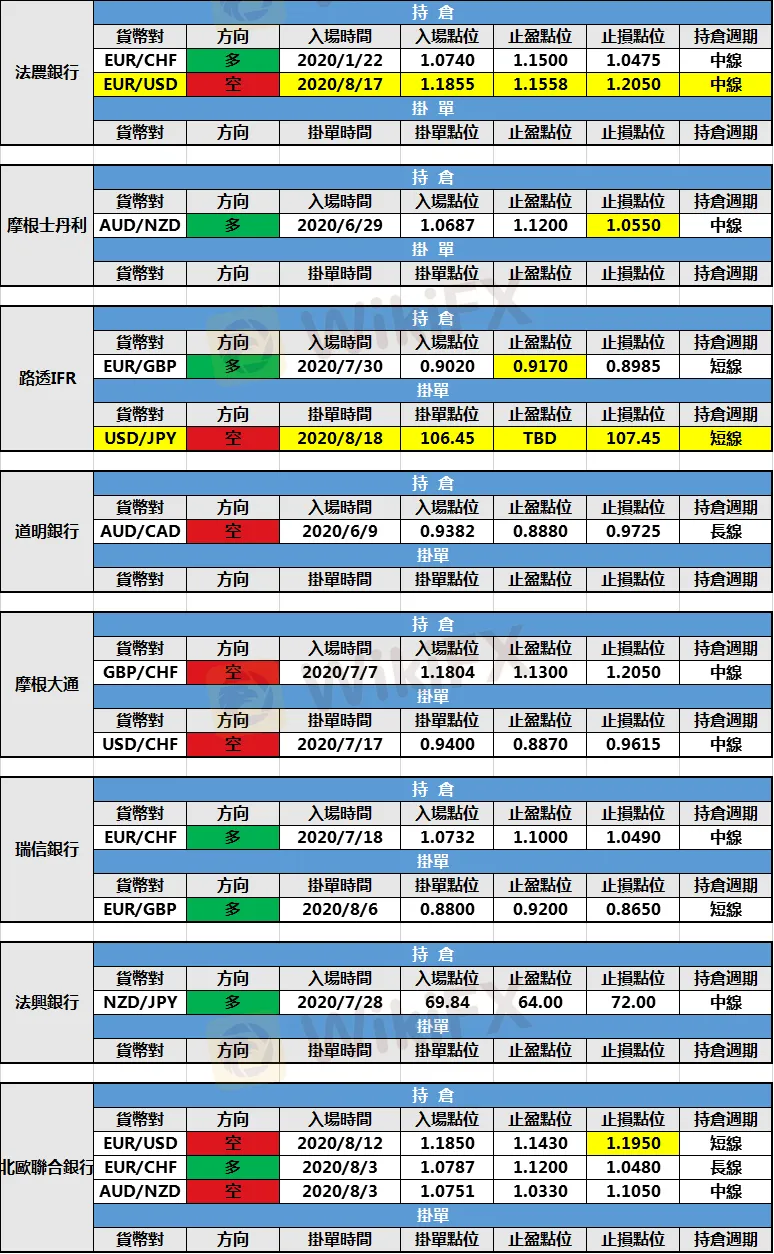 (1)法農銀行新增歐元/美元空頭持倉,入場點位1.1855,止盈點位1.1558,止損點位1.2050。