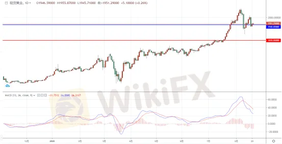 週五(8月21日)亞市盤中,現貨黃金小幅上漲,目前交投在1950美元附近,本週三金價遭到暴擊失守2000關口。