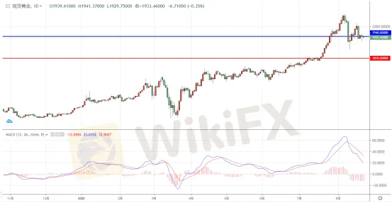 匯信團隊指出,現貨黃金週五收報1939.42美元/盎司,下跌7.07美元或0.36%。日內,現貨黃金最高觸及1955.70美元/盎司,最低觸及1911.00美元/盎司,波動幅度高達逾40美元。今天亞市早盤現貨黃金進一步延續弱勢調整格局,金價暫位於1933.46美元/盎司附近整理交投。從日K圖上看,現貨黃金近期持續位於歷史性高位運行,整體呈現出震盪上行態勢,主要是由於疫情影響下的長期寬鬆預期,以及近期市場對於疫情2.0的擔憂,疊加國際貿易局勢以及日趨緊張的地緣政治風險,黃金多頭行情爆發,隨著新冠肺炎疫情病例的大幅增加,市場避險情緒持續升溫,黃金連續攻克1800、1900關口,在地緣政治風險攀升的情況下,疊加超低利率環境和美國新一輪經濟刺 激計畫。黃金高位持續發力,接連大幅飆升,史上首次突破2000大關後一路高歌猛進。不斷刷新歷史新高,此前最高上探至2075一線。但是隨著經濟數據好轉,疫情擔憂減弱,美元走強都削弱了市場對於黃金的偏好,黃金仍維持弱勢震盪,短線關注1940關口的壓力,長線投資者需要關注下方的關鍵支撐位這波行情的爆發點1810關口。(僅供參考)