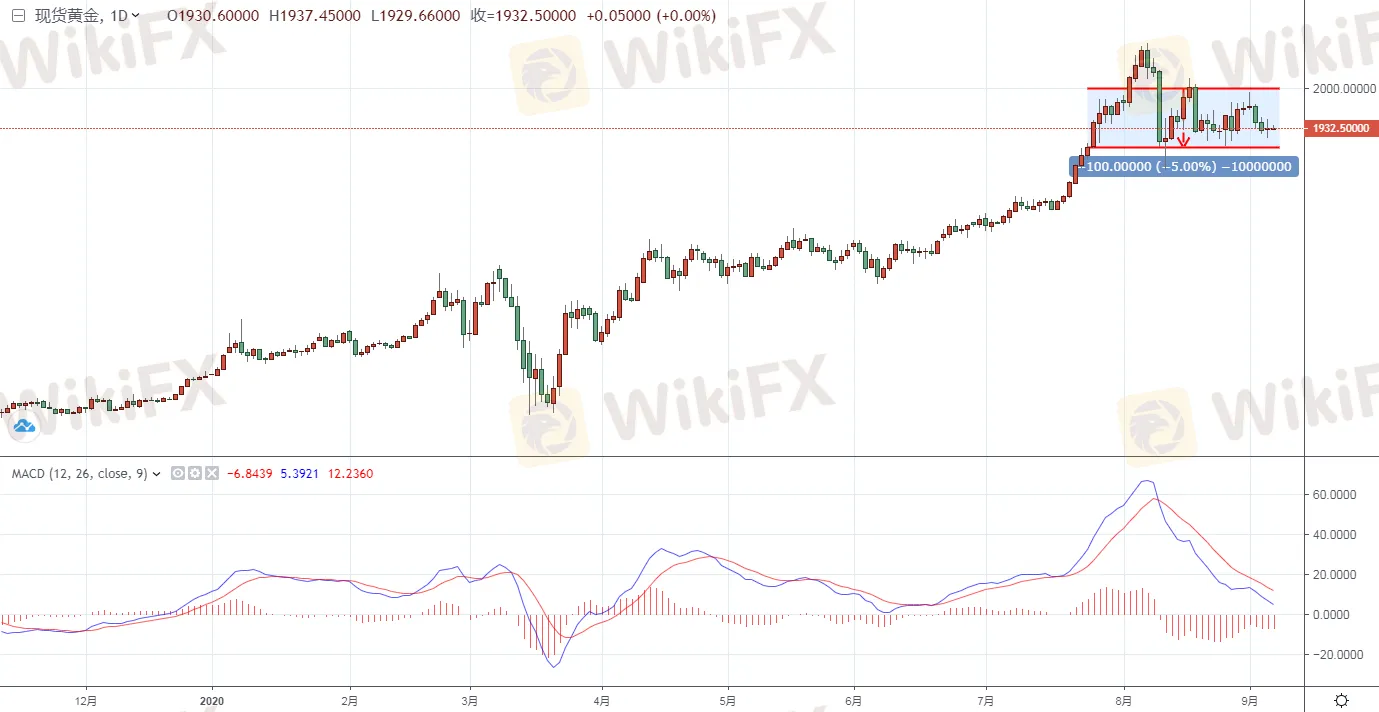 現貨黃金上周五收報1933.57美元/盎司,上漲3.36美元,盤中最高觸及1943.90美元/盎司,最低觸及1916.24美元/盎司。上周現貨黃金累計下跌30.94美元或1.57%。今天早盤金價進一步延續弱勢調整,目前金價仍位於1930關口附近徘徊,暫報1932.32美元/盎司。從近期的表現看,金價整體呈現出寬幅震盪,金價雖然出現持續回落,但是整體仍位於1900-2000美元箱體內震盪整理交投,並未跌破箱體震盪區間,位於區間內投資者可以關注箱體上下沿線,逢高做空,而逢低可以適當做多,突破箱體止損。(僅供參考)