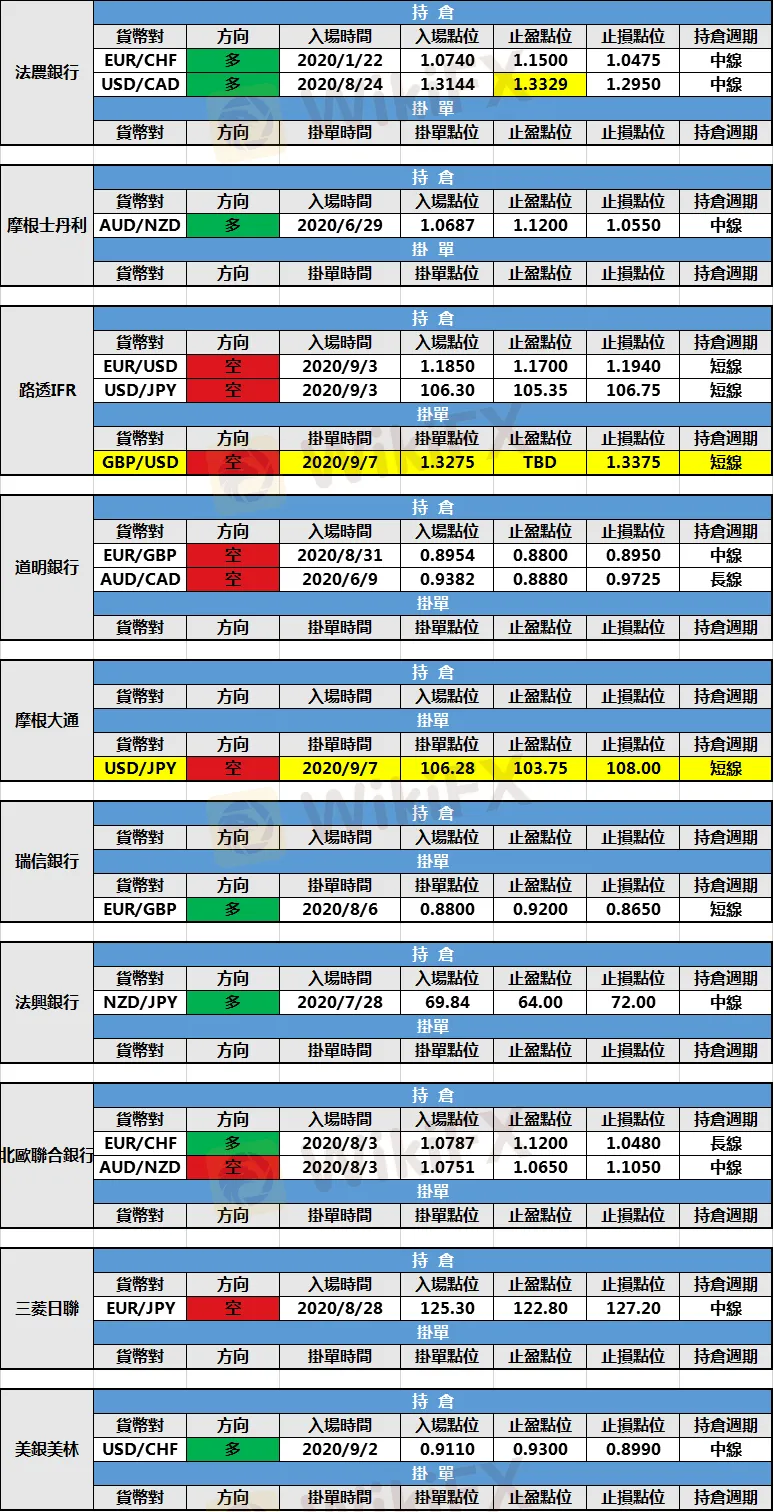 (1)摩根大通取消美元/瑞郎空頭掛單;新建美元/日元空頭掛單,掛單點位106.28,止盈點位103.75,止損點位108.00。