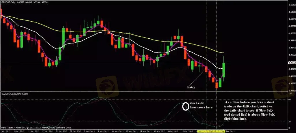 · 慢速隨機指標,參數設置(13,5,5)應用在4小時和日線圖兩個週期框架圖表上;