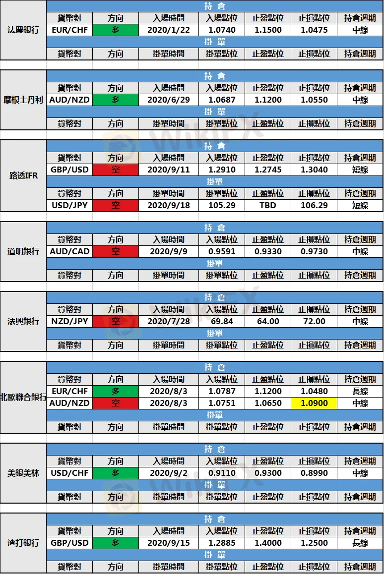 美元指數下挫,非美貨幣上揚。北歐聯合銀行修改澳元/紐元空頭持倉止損,三菱日聯歐元/日元空頭持倉浮盈提前出局。