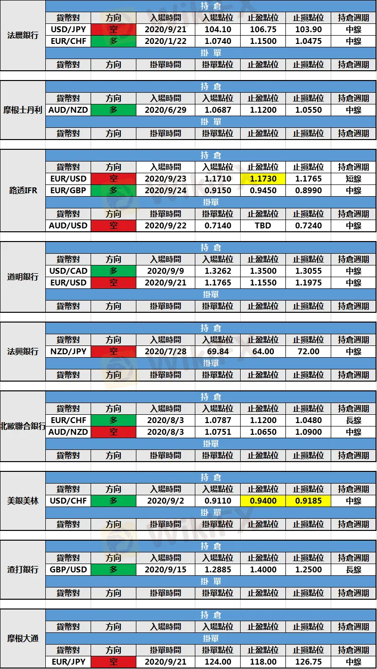 (1)道明銀行美元/加元多頭持倉盈利提前出局。歐元/美元空頭持倉提前出局。
