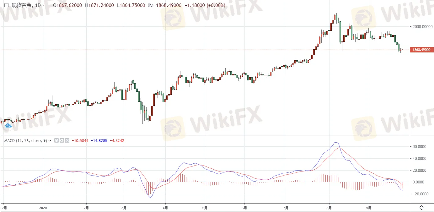 現貨黃金收報1867.26美元/盎司,上漲4.21美元或0.23%,盤中最低觸及1848.22美元/盎司,最高觸及1877.00美元/盎司。今日早盤現貨黃金微微走高,三連陰後昨日止跌反彈收紅,今天延續反彈之勢,進一步上逼1870關口。從近期的表現看,金價整體呈現寬幅震盪格局,從趨勢看,金價反彈高點不斷被壓低,雖然避險情緒有所回升,但是由於市場對於目前已知的風險已經麻木,不能刺 激金價的進一步走高,目前金價由於短線技術性超跌,疊加市場對於美國大選的不確定擔憂,黃金止跌回升上逼1870關口,短線下方MACD顯示做空動能依然較強,做多仍需謹慎。(僅供參考)