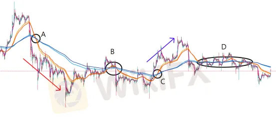 B:這裏的均線開始進入交叉,並且K線與均線的關係呈現來回穿插的現象,這種走勢表示沒有明確的方向,行情進入橫盤。