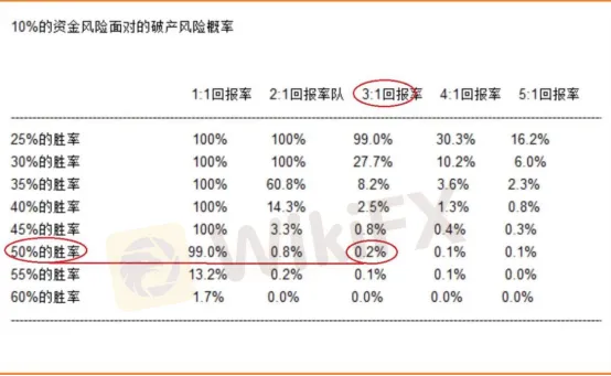 假設我們以長週期交易勝率50%計算,那麼在3:1的盈虧比下,從表格中我們可以得到帳戶爆倉的風險僅為0.2%,那麼也就是接近不可能爆倉。當然這只是理論值,要是大家在實戰過程當中忽略了交易規則,倉位任意放大,或者頻繁進出,改變了盈虧比,那麼結果爆倉的話,就不是表格數據的問題了!