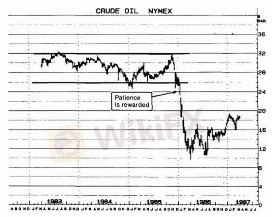 (1983 到 1985 年的三年內,原油在 26.00 到 32.00 的寬大區間內起伏。長線倉位操作者的系統每見市價漲向區間上檔,就發出買進信號,跌到下檔又發出賣出信號,把他們搞得七葷八素,慘遭上沖下洗的損失。但是他們的耐性終於得到報償。1986 年 1 月,市場跌破區間底部並繼續下滑到 11.00。這裏要說明的一點是:你一定要始終如一遵守所有的操作信號,因為一月初下跌段的大利潤超過市場橫向盤整期間一連串的小損失。)