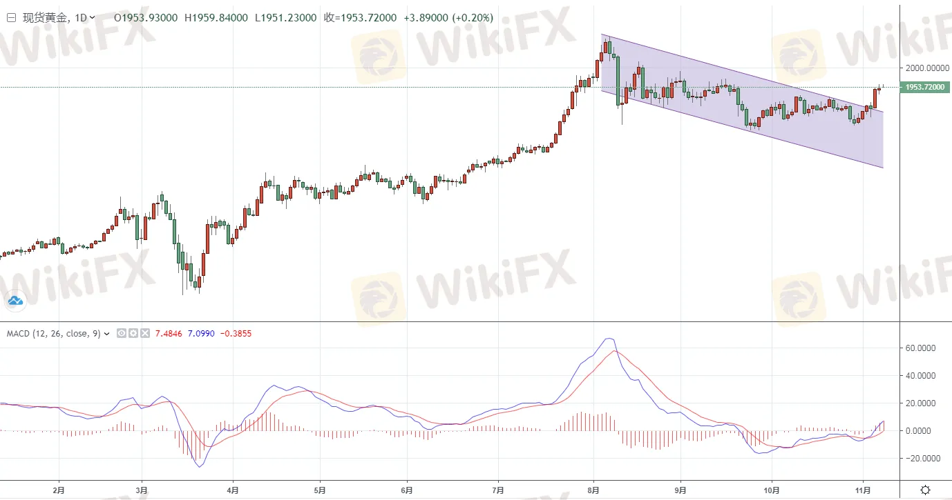現貨黃金上周五報收1950.86美元/盎司,上漲1.59美元或0.08%,盤中最高觸及1960.31美元/盎司,最低觸及1935.49美元/盎司。上周現貨黃金累積上漲72.07美元或3.84%。今天現貨黃金延續近期的上行趨勢再度小幅走高,暫報1953.72美元/盎司。從近期的表現看,金價整體呈現出高位回落的格局,從趨勢看,金價反彈高點不斷被壓低,由於市場對於目前已知的風險已經麻木,致使黃金連續承壓回落。但是伴隨著歐美疫情的進一步加劇,美國大選仍具不確定性等均使得市場避險情緒回升,而且市場對於新一輪更大的刺 激方案更具信心,美元走弱,黃金持續上行,並且下方的MACD指標也顯示做多動能在逐步增強,短線仍有望進一步走強。(僅供參考)