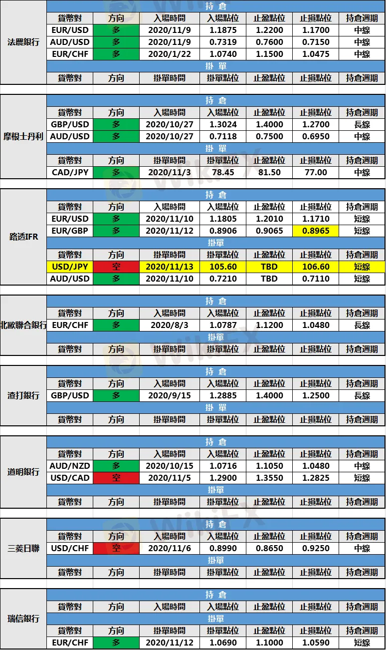 (1)路透IFR再次新建美元/日元空頭掛單,掛單點位105.60,止盈點位暫未設定,止損點位106.60。