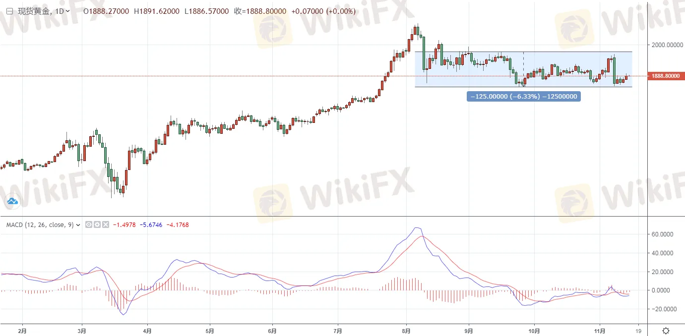 黃金方面,週一(11月16日)亞市早盤現貨黃金延續近期的回升之勢,再度微幅走高,金價暫位於1889.46美元/盎司附近整理交投。由於疫情病例仍在增加,此外市場對於經濟復蘇出現進一步擔憂,均提振了金價的反彈。