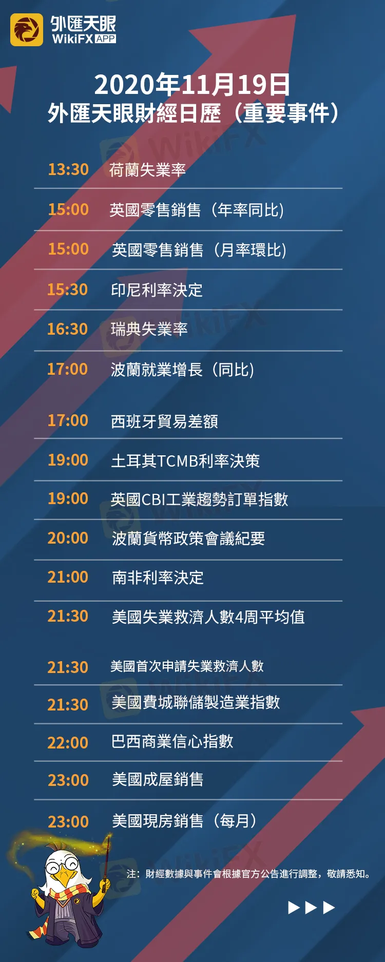 以下為11月19日(週四)重要財經事件,敬請關注外匯天眼APP,或官方網站!