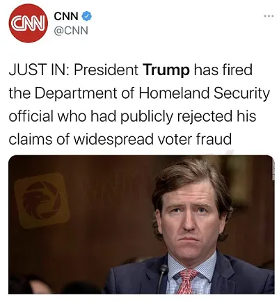 特朗普在推文中寫道:“Chris Krebs最近發佈的關於2020年大選的聲明非常不准確,因為在這次總統選舉中存在大量不當手段和欺詐行為,包括‘過世者’投票、選舉觀察人士不允許進入投票地點、‘故障’的投票機將特朗普的選票改為拜登的選票、延遲投票等更多問題。因此,網路安全與基礎設施安全局局長Chris Krebs被解除職務,立即生效。”