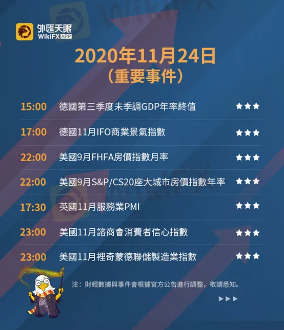 以下為11月24日(週二)重要財經事件,更多資訊,請關注外匯天眼APP或官方網站!