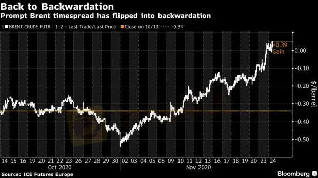 值得一提的是,隨著亞洲買家需求湧現、新冠疫苗前景樂觀,作為交易員看漲程度的重要指標,石油期貨曲線已達到新冠疫情初期以來的最強水準。