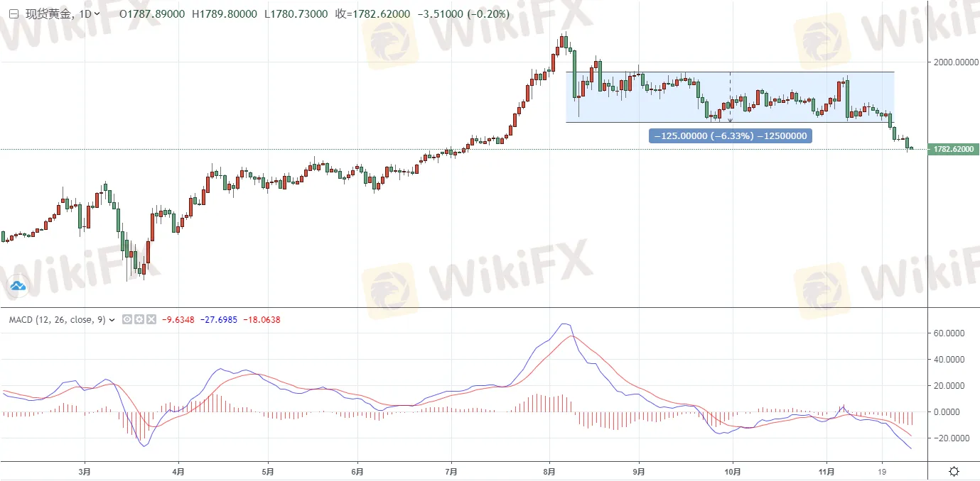 現貨黃金上周五收報1786.13美元/盎司,大跌21.92美元或1.21%,盤中最高觸及1813.76美元/盎司,最低觸及1774.00美元/盎司。上周,現貨黃金下跌84.71美元,跌幅達4.53%。今天現貨黃金再度小幅走低,下逼1780關口,暫報1782.46美元/盎司。從近期的表現看,金價整體呈現出高位回落的格局,從趨勢看,金價反彈高點不斷被壓低,由於市場對於目前已知的風險已經麻木,致使黃金連續承壓回落。隨著疫苗的利好頻出,市場的風險情緒大受鼓舞避險資產黃金則遭冷落,持續回落下挫,上周五一度失守1780關口。從圖中不難發現,在跌破1850-1975區間後,金價開啟單邊暴跌模式,從目前看,下方的MACD指標顯示做空動能仍在逐步增強,短線仍是空頭行情,不可盲目抄底。(僅供參考)