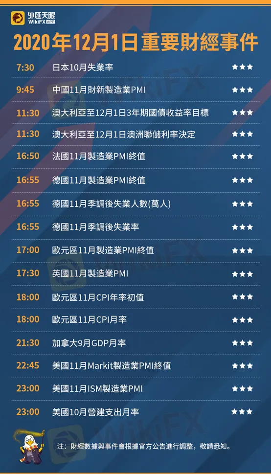 以下為12月1日(週二)重要財經事件,更多資訊,請關注外匯天眼APP或官方網站!