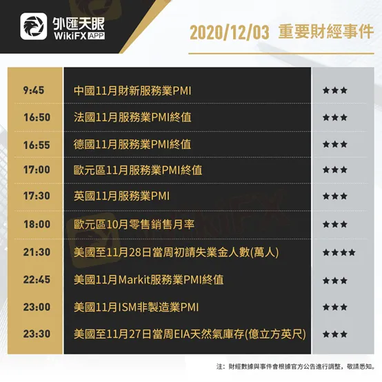 以下為12月3日(週四)重要財經事件,更多資訊,請關注外匯天眼APP或官方網站!