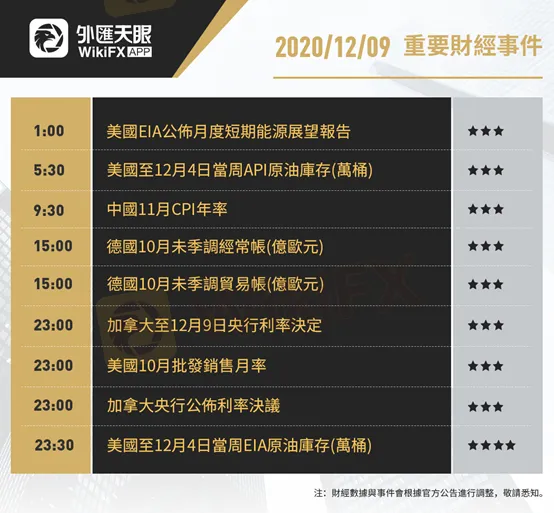 以下為12月9日(週三)重要財經事件,更多資訊,請關注外匯天眼APP或官方網站!