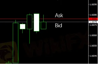 外匯交易總是有2個報價同時存在,即Ask和Bid,MT4軟體用Bid報價畫k線圖,也有一些軟體用Ask報價畫k線的。如下圖所示,Bid報價(水準白線)總是低於Ask報價(水準紅線),兩個報價的差距就是點差:
