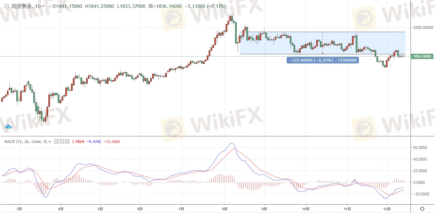 黃金方面,週一(12月14日)亞市早盤現貨黃金維持窄幅震盪,日內微幅走低,由於新冠疫苗方面取得更多進展引發了市場的樂觀情緒,增強了人們對經濟復蘇的信心,但多國進隔離措施也在一定程度上提振了避險情緒,致使金價位於1835關口附近徘徊。