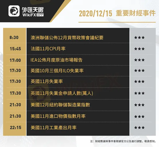 以下為12月15日(週二)重要財經事件,更多資訊,請關注外匯天眼APP或官方網站!