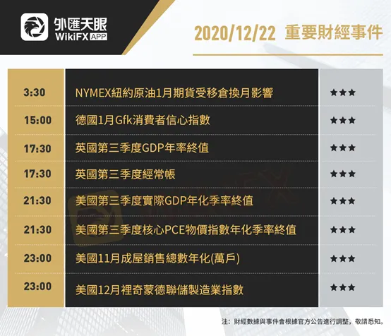 以下為12月22日(週二)重要財經事件,更多資訊,請關注外匯天眼APP或官方網站!