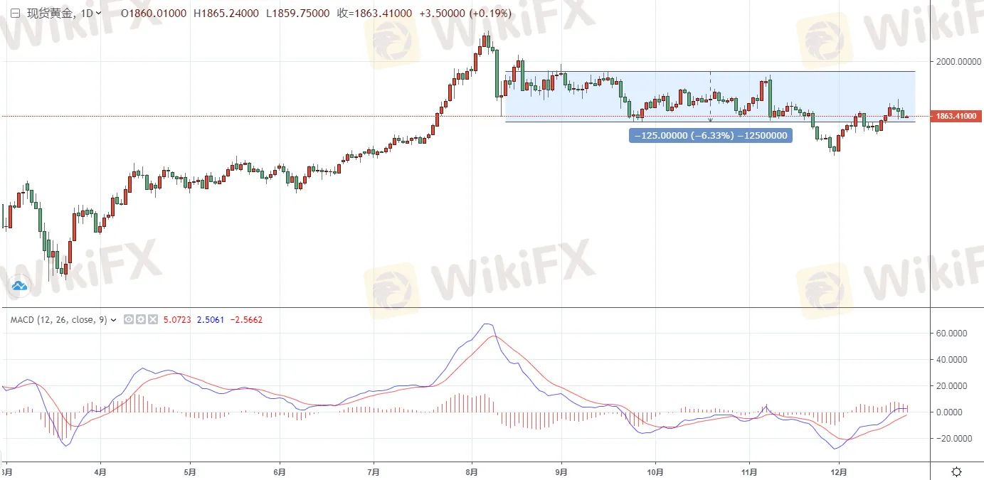 摘要:黃金方面,週三(12月23日)亞市早盤現貨黃金經過3連陰後日內小幅走高,目前暫報1863.59美元/盎司。由於市場對於新冠疫情變種擔憂加劇,美經濟數據強勁,致使避險資金湧入美元,削弱了對於黃金的需求,致使黃金承壓回落徘徊於1860關口附近。