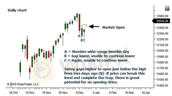在日內交易中,他非常看重當日開盤位置,本文通過案例來深入探討他的開盤“反轉”模式。我們先切換到日線週期,看看當日開盤情況。
