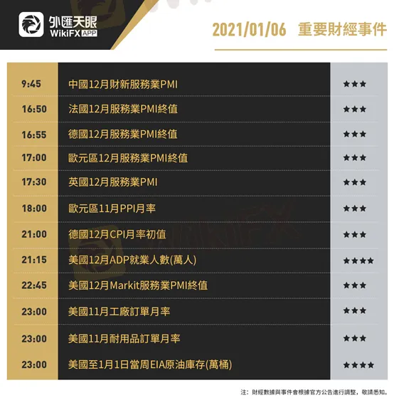以下為1月6日(週三)重要財經事件,更多資訊,請關注外匯天眼APP或官方網站!