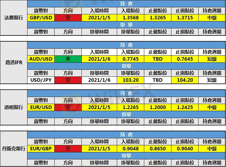 (1)路透IFR新建美元兌日元空頭掛單,入場點位103.20,止盈點位暫未設定,止損點位104.20。
