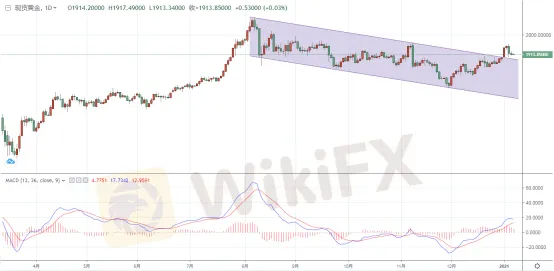 現貨黃金昨日收報1913.81美元/盎司,下跌4.65美元或0.24%,盤中最低觸及1908.16美元/盎司,盤中最高觸及1927.62美元/盎司。今天現貨黃金早盤延續了此前的回落態勢,日內暫維持窄幅震盪,暫報1913.91美元/盎司。從近期的表現看,金價整體呈現出高位回落的格局,從趨勢看,金價反彈高點不斷被壓低,由於市場對於目前已知的風險已經麻木,致使黃金連續承壓回落。從圖中不難看出,金價通過1月4日的一根光頭光腳的大陽線方式突破了下行通道的束縛,此後持續上行,在黃金錄得5連陽後,黃金昨日遭受重創,但是不難發現,下行通道的上沿線的支撐力度較強,目前金價雖出現回落,但是仍位於下行通道上方運行,並且下方的MACD指標顯示目前雖動能減弱但仍是多頭情緒占優,投資者仍可把握機會做多,下方的止損位在下行通道上沿線。(僅供參考)