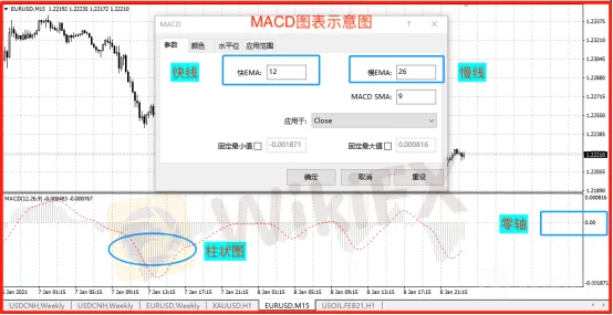 見下麵圖,圖表中k線圖下方的技術指標就是MACD,由4個部分組成。